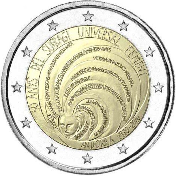 Pamětní bimetalová mince Andorry 2020, nominální hodnoty 2 EURO, "50 let všeobecného volebního práva žen v Andoře" - mince byla emitována a dodává se pouze v mincovní kartě